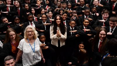 Although rumours had spread about the identity of their special guest, most of the pupils waiting inside and onlookers gathered at the school gates were audibly surprised when Meghan arrived on Friday, to be warmly greeted by headteacher Russell Taylor.