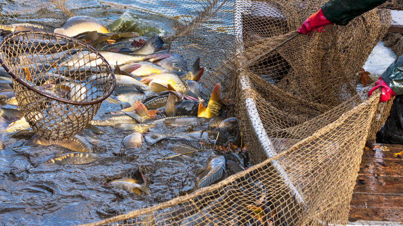 Once the fish are big enough for sale, a drain will be opened in the tank, whooshing away fish and water into a processing area. The fish are stunned with an electric current before they filleted for sale.