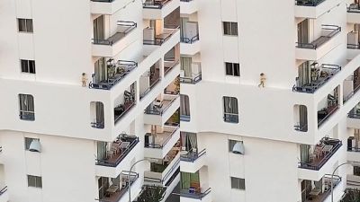 The little girl appears to climb out a window before walking along the narrow ledge in Playa Paraiso, Tenerife.