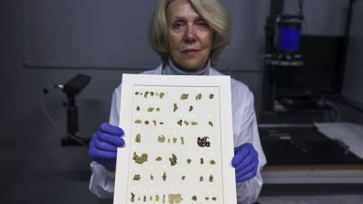 Tanya Bitler displays the recently-discovered 2000-year-old biblical scroll fragments