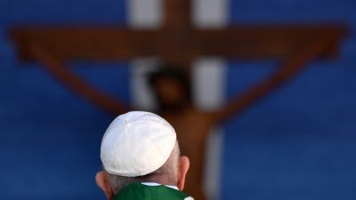 Pope Francis celebrates an outdoors mass during a visit to Bari, southern Italy, on February 23, 2020 to address a conference entitled "Mediterranean: Frontier of Peace" which sees the participation of some 60 Catholic bishops from 19 nations bordering the Mediterranean. Alberto PIZZOLI / AFP