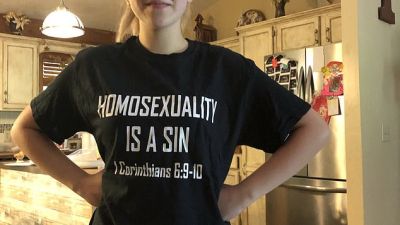 A street preacher from Tennessee is suing a school district after his 15-year-old daughter was kicked out of class for wearing a shirt that read 'Homosexuality is a sin.'