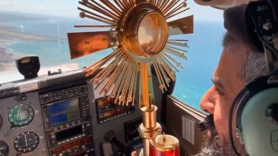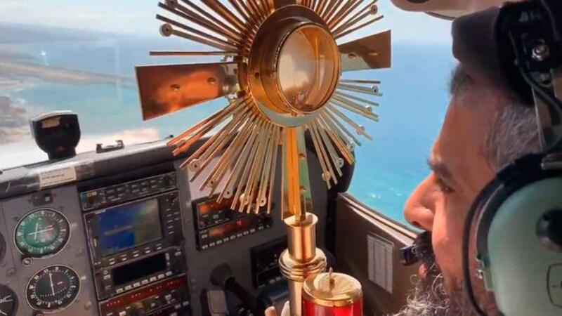 Equipped with a cross, a statue of the Blessed Virgin Mary, and a monstrance, the priest flew over Beirut and surrounding areas for two hours as he "pleaded with the Lord to protect Lebanon", media reported.