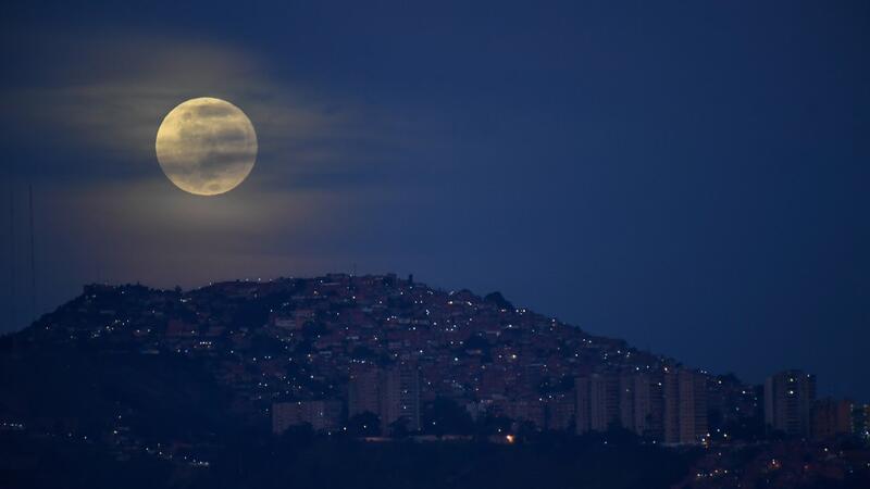The "blue moon", the second full moon of a calendar month, is seen over the Valle shantytown in Caracas, on October 31, 2020. Federico PARRA / AFP