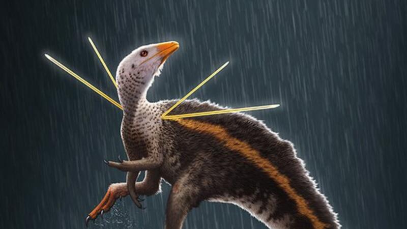 A peacock-like elaborate dinosaur with a mane of yellow and brown fur down its back and long 'needles' growing from its shoulders has been identified.