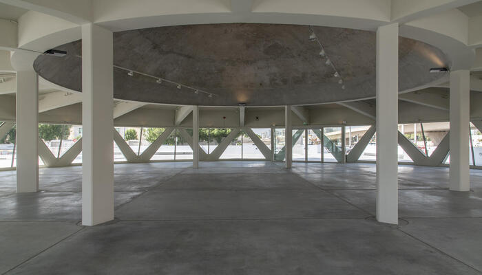 Three years after acquiring the building in 2012, Sharjah Art Foundation began the process of returning The Flying Saucer to its prior form in preparation for the exhibition 1980-Today: Exhibitions in the United Arab Emirates, curated by Hoor Al Qasimi for the National Pavilion UAE La Biennale di Venezia at the 56th International Art Exhibition that year. For this temporary renovation, the building was stripped of its exterior cladding and interior elements, including the false ceiling and partitions, fully revealing its over seven-metre high dome and impressive structure.