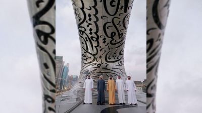 His Highness Sheikh Mohammed bin Rashid Al Maktoum, the Vice-President and Prime Minister of UAE and Ruler of Dubai, along with Sheikh Hamdan bin Mohammed bin Rashid Al Maktoum, Crown Prince of Dubai, and Sheikh Maktoum bin Mohammed bin Rashid Al Maktoum, Deputy Ruler of Dubai, Deputy Prime Minister and Minister of Finance, inaugurated the iconic landmark during a grand ceremony that saw the Museum's exterior facade transform into a work of art.