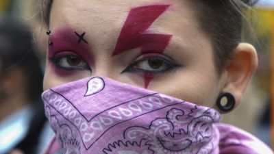 A woman sports a lightning bolt painted over her eyes as she attends a demonstration against the tightening of Poland's already restrictive abortion law on October 28, 2020 in Warsaw. Women in Poland walked off the job and hit the streets nationwide on October 28, 2020, the seventh straight day of mass protests over a court ruling to impose a near-total abortion ban in Poland. JANEK SKARZYNSKI / AFP