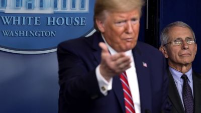 U.S. President Donald Trump speaks as Director of the National Institute of Allergy and Infectious Diseases Dr. Anthony Fauci looks on during a news briefing on the latest development of the coronavirus outbreak in the U.S. at the James Brady Press Briefing Room at the White House March 20, 2020 in Washington, DC. With deaths caused by the coronavirus rising and foreseeable economic turmoil, the Senate is working on legislation for a $1 trillion aid package to deal with the COVID-19 pandemic. President Trum
