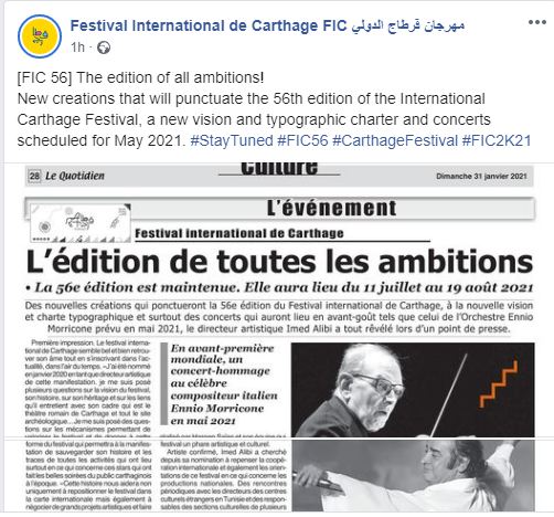 Tunisia is optimistic that its annual Carthage International Festival (FIC), cancelled in 2020 due to the COVID-19 pandemic, will live up to expectations in 2021.