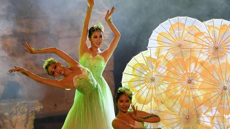 Chinese dancers perform during the opening of the 54th session of the International Carthage Festival at the Roman theatre of Carthage on August 11, 2018 in Tunis. (AFP)