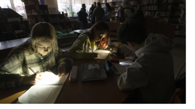 Hundreds of laptop-toting professionals and students line up outside the public library in the Ukrainian town of Irpin, desperate to get plugged in and online amid the latest energy blackout.