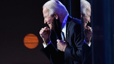 US President-elect Joe Biden gestures to the crowd after he delivered remarks in Wilmington, Delaware, on November 7, 2020. (AFP)