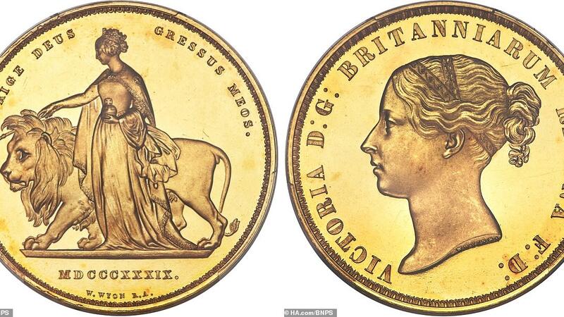 The 1839 'Victoria Una and the Lion' five pound coin shows the 20-year-old queen leading a lion representing the British Empire.