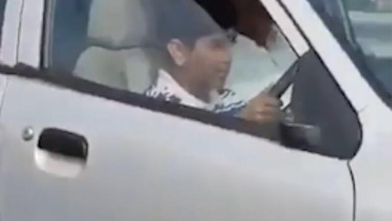 He turns his head away abruptly as the car recording continues ahead, which is where the video ends.
