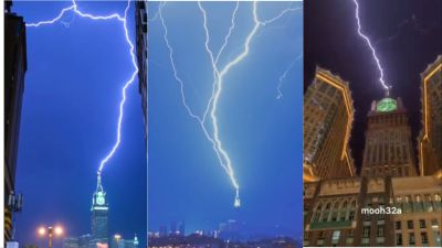 A particular video clip captured a stunning streak of lightning striking the top of the iconic Clock Tower, illuminating the night sky for an astonishing four seconds. The dramatic lightning display was accompanied by heavy rain, which was met with gratitude by those at the Grand Mosque, offering respite from the scorching heat.