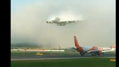 The video, which has been viewed 7,300 times as of 8.13pm UAE time, shows the plane making an appearance after emerging through low-lying clouds even as other planes wait at the taxiway for their turn to take off.