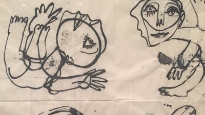 A hazy, almost impressionistic image of a horizon. Charcoal sketches of bottles and flowers.