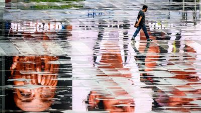 A man wearing a facemask, amid concerns over the spread of the COVID-19 coronavirus, walks among puddles reflecting advertisement screens on an empty square in Bangkok on March 15, 2020. Mladen ANTONOV / AFP