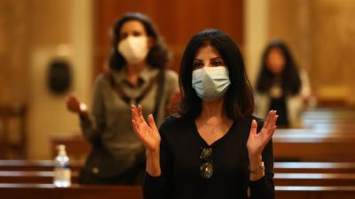 Christian worshippers maintain social distancing as they attend a Sunday mass following the reopening of Saint George Maronite Church in the Lebanese capital Beirut amid the ongoing COVID-19 pandemic, on May 10, 2020. ANWAR AMRO / AFP