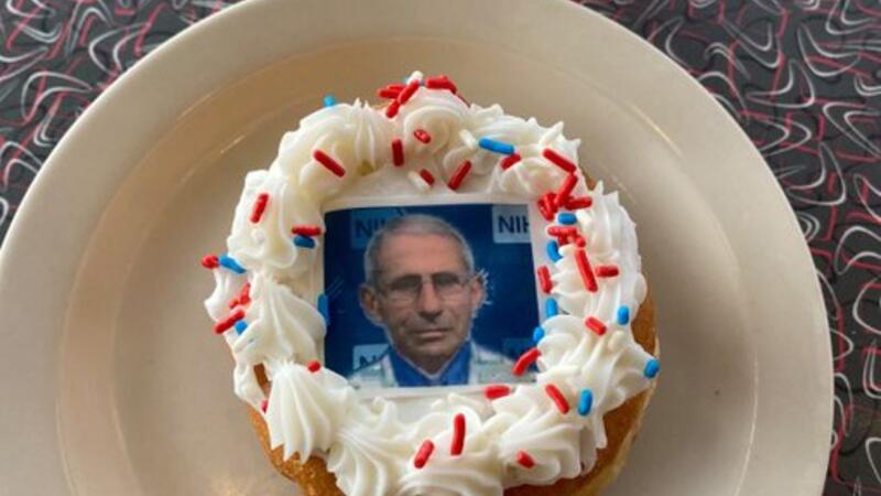 The doughnut is made by printing an image of Fauci, 79, onto thin edible paper placed on top of a thick layer of buttercream frosting.