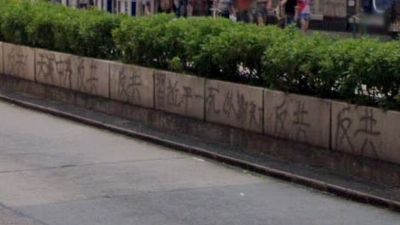 Another pro-democracy phrase spray-painted on the main road was also blurred.