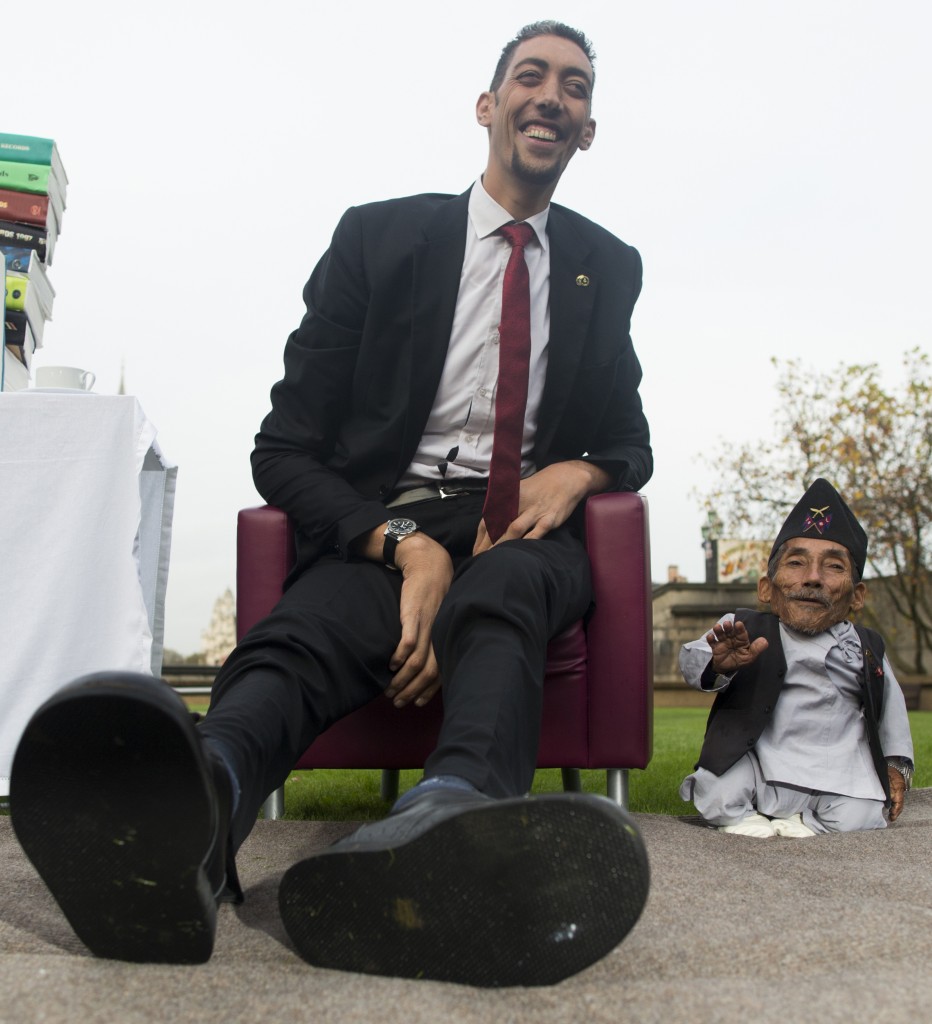 Chandra Bahadur Dangi, from Nepal, (R) the shortest adult to have ever been verified by Guinness World Records, is pictured with the world's tallest man Sultan Kosen from Turkey, during a photocall in London on November 13, 2014, to mark Guinness World Records Day. Chandra Dangi, measures a tiny 21.5in (0.54m) – the same height as six stacked cans of beans. Sultan Kosen measures 8 ft 3in (2.51m). AFP PHOTO / ANDREW COWIE (Photo by ANDREW COWIE / AFP)