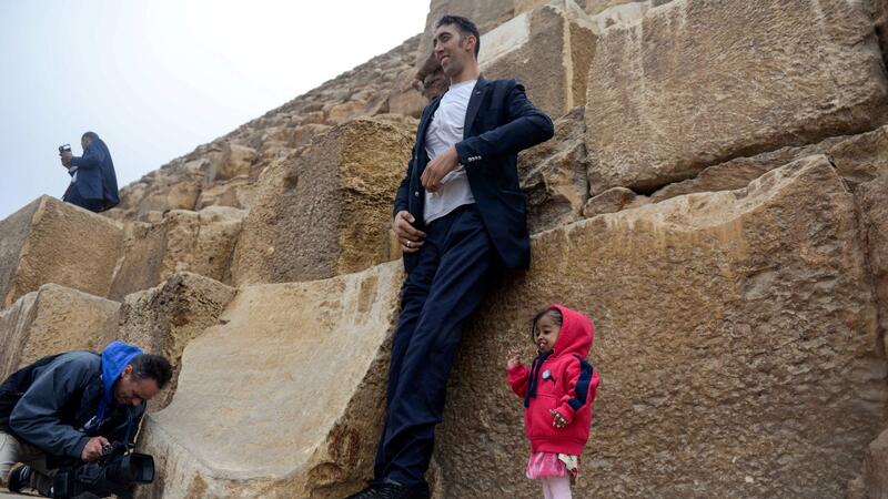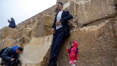 India's Jyoti Amge (R), the world's shortest woman poses for a picture with Sultan Kosen (C) of Turkey, the world's tallest man, at the foot of one of the three Pyramids of Giza in Egypt on January 26, 2018. (Photo by STRINGER / AFP)