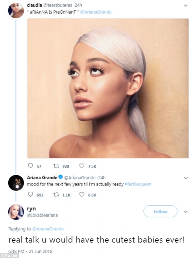 When another follower posted a picture of the hitmaker rolling her eyes with the caption 'Ariana is pregnant', she replied: 'mood for the next few years til i’m actually ready #fertilequeen.'