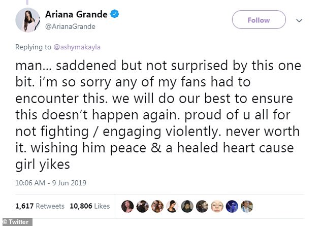 The singer, 25, reached out to her fans following the vile protest and said in response to the first video: 'Man... saddened but not surprised by this one bit. i’m so sorry any of my fans had to encounter this. we will do our best to ensure this doesn’t happen again.