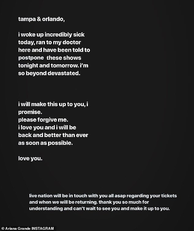 The Thank u, Next artist wrote: 'tampa & orlando, I woke up incredibly sick today, ran to my doctor here and have been told to postpone these shows tonight and tomorrow. I'm so beyond devastated.'