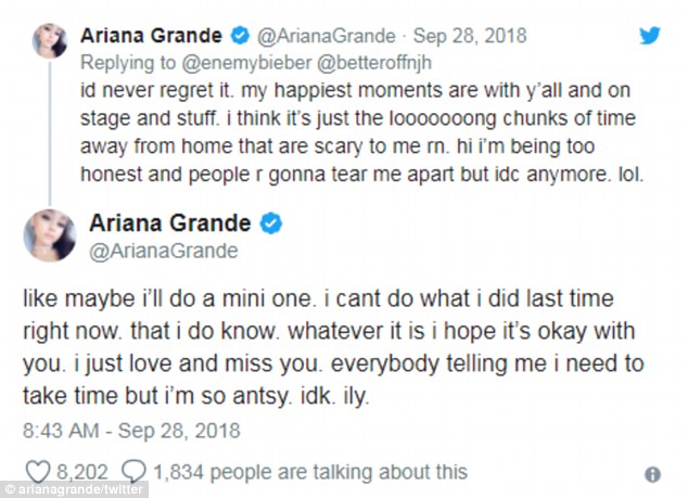 In response to one fan, @betteroffnjh, who missed the star but hoped the she was taking care of herself, Ariana was quite frank, answering 'i kno. but i miss u. i’m antsy. can’t sit still. i wanna tour now. yesterday i jus wanted to sit home forever but today i wanna do shows and see u. it’s all v up n down rn. but hi ily. i am working on it. i’ll keep ya posted.'