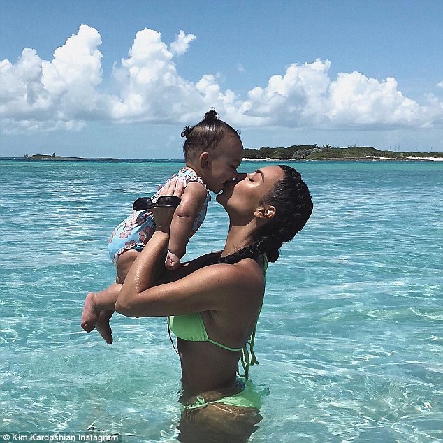 She placed a kiss on her daughter - whom she shares with Kanye West - as she captioned the photo: 'My cherry blossom baby'.