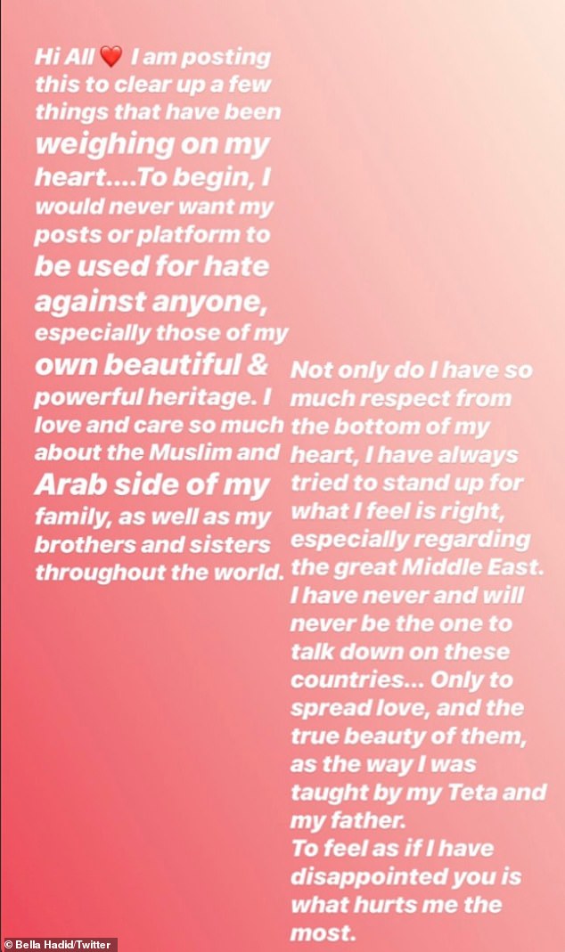 Bella's father is a Palestinian and she wrote that she 'would never want my posts or platform to be used for hate against anyone, especially those of my own beautiful & powerful heritage.'