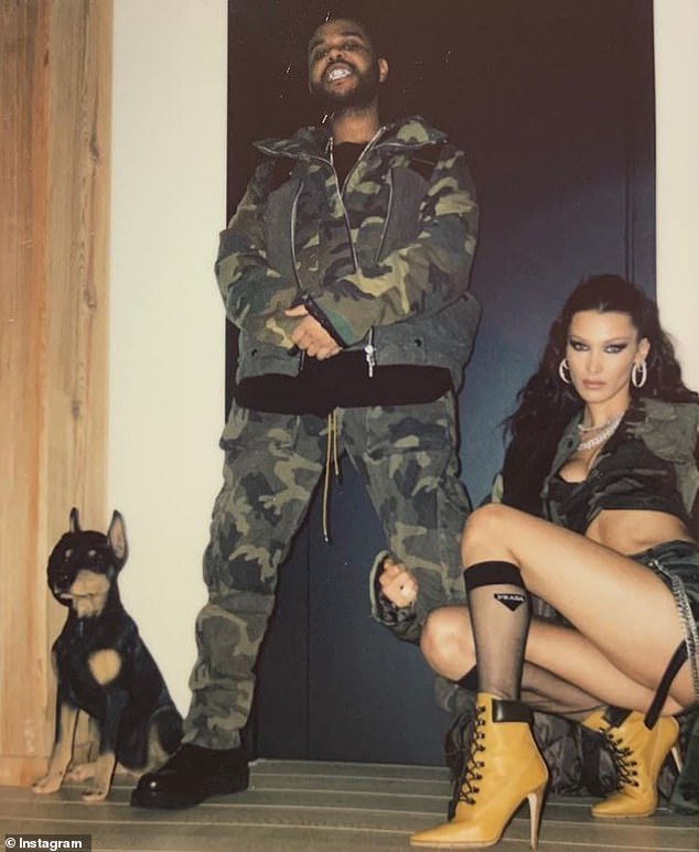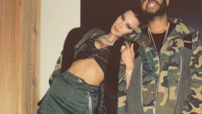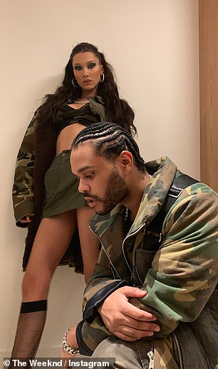 The Weeknd (real name: Abel Tesfaye) matched his lady love in a camo jacket and trousers on top of a black shirt.