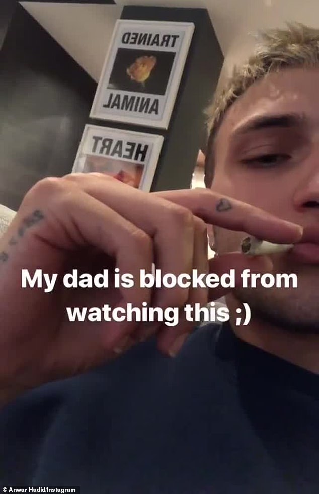 Meanwhile, Bella's younger brother Anwar Insta-storied a video of himself Saturday smoking a joint, which he captioned: 'My dad is blocked from watching this'