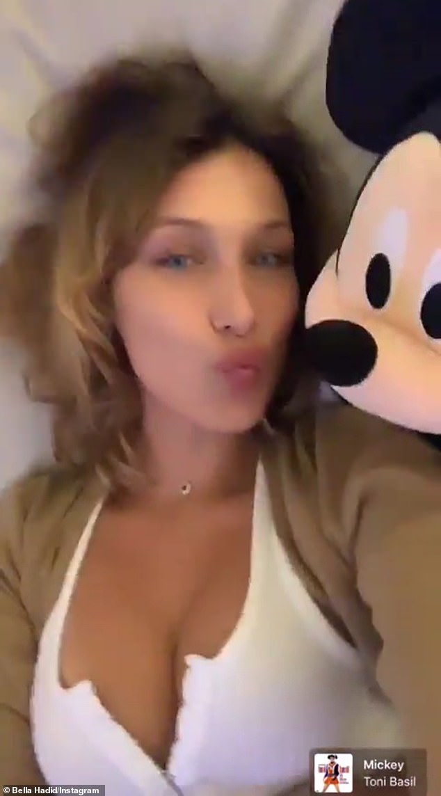 Flirty: Bella Hadid, 22, took to her Instagram Story and shared a video of her snuggling up in bed with Mickey Mouse with the Toni Basil 1982 hit song Mickey playing in the background
