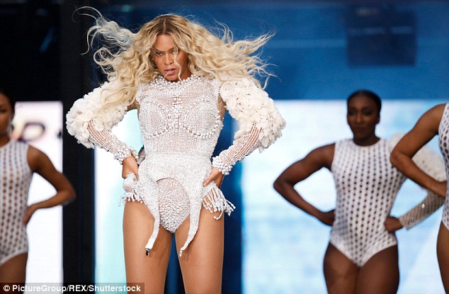 Work: The Crazy in Love hitmaker, 36, showed off her toned curves in an pearl studded bodysuit which featured elaborately adorned sleeves and a glittering suspender belt