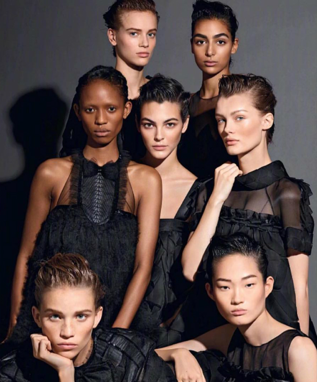 Styled by Carine Roitfeld, Attal wore a black dress alongside fellow models Sarah Dahl, Hyunji Shin, Rebecca Longendyke, Adesuwa Aighewi, Vittoria Ceretti, and Kristina Grikaite.