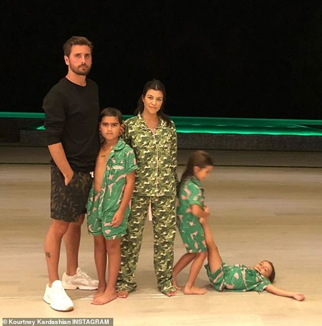 Kourtney wore a pair of pajamas while her children sported matching tropical print outfits.