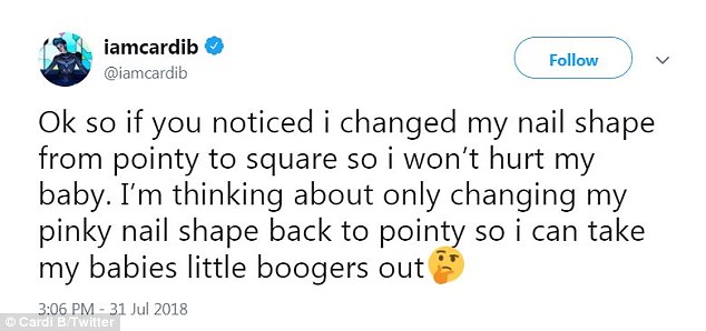 'Ok so if you noticed i changed my nail shape from pointy to square so i won’t hurt my baby,' wrote the Bodak Yellow rapper.