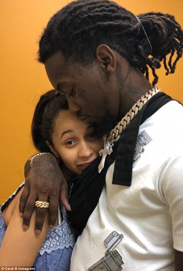 Cardi was wearing a blue jean dress sans makeup and a high ponytail while Offset was all blinged out with his arm around his wife's neck.