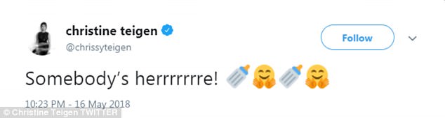 The 32-year-old wrote on her social media feed: 'Somebody's herrrrrrre!' alongside some cute baby bottle emojis. Her husband John Legend later retweeted the post.