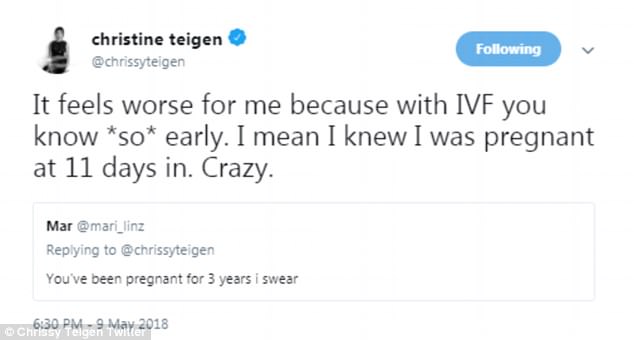 Quick notice: In a follow up tweet, Chrissy wrote, 'It feels worse for me because with IVF you know *so* early. I mean I knew I was pregnant at 11 days in. Crazy.'