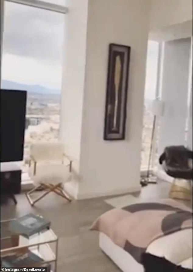 Chic: Videos shared of the new home to Demi's Instagram reveal a mammoth living room with floor-to-ceiling windows, cream decor and opulent artwork