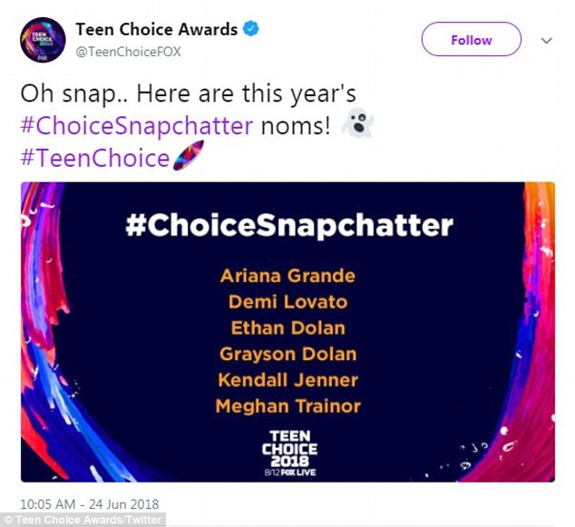 Who will win? Demi (born Demetria) will next compete for five trophies - including Choice Snapchatter - at the fan-voted Teen Choice Awards airing August 12 on Fox
