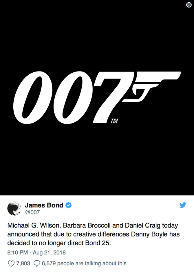 "Michael G. Wilson, Barbara Broccoli and Daniel Craig today announced that due to creative differences Danny Boyle has decided to no longer direct Bond 25," a statement on the film series' official website said.