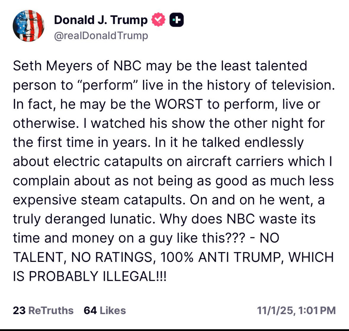 Donald Trump slams Seth Meyers again, calling him “The Least Talented Person on TV”