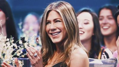 Aniston can be seen flashing a cheeky grin with big hair and large hoop earrings.