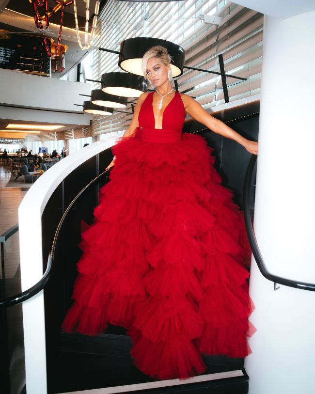 US singer Bebe Rexha wore a voluminous scarlet gown by Bahraini label Monsoori, while up-and-coming star Ella Mai opted for a billowing blue gown by Lebanon-based Ashi Studio. For her part, Ashlee Simpson wore a feathered jumpsuit by Lebanon’s Georges Chakra in a silver and nude palette.